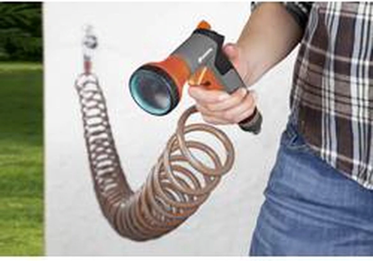 Gardena spiraalslang-set Ideaal voor het watergeven aan planten op balkon en terras of voor de besproeiing van bijv. de voortuin. Maakt lastig op- en afrollen van de tuinslang of slepen met gieters overbodig. Na gebruik veert de slang door de trekkracht van de spiraal automatisch weer terug. Inhoud: 10 m spiraalslang compleet met slangstuk en waterstop, pistoolbroes 8120, kraanstuk 900, 901 en 902.