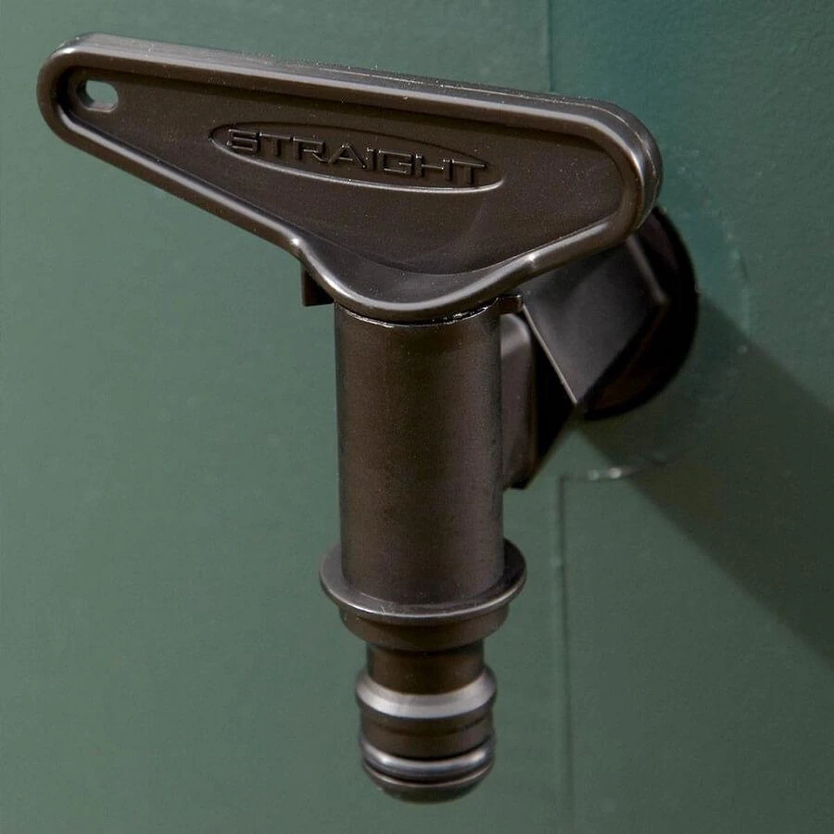 kunststof, groen. Met kunststof deksel (kinderveilig), zwarte aftapkraan en speciale kraan, geschikt voor koppelstukken (b.v. Gardena). Onverwoestbaar, weer- en vorstbestendig (wel aftappen).