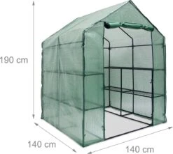 Met de hobbykas geniet je van de lente tot de herfst van verse groente en vers fruit. De broeikas waar je in kunt staan, kun je met dank aan het modulaire systeem in elkaar zetten zonder dat je er gereedschap voor nodig hebt. De stalen buizen worden met de groene folie afgedekt. Zorg ervoor dat de weerbestendige kweekkas nog steviger staat met behulp van de haringen en het touw. Aan de binnenkant van de kas is genoeg ruimte voor kleine planten die je kwijt kunt op een rek met 2 etages. Je kunt de tomatenkas trouwens ook gebruiken zonder de rekken.